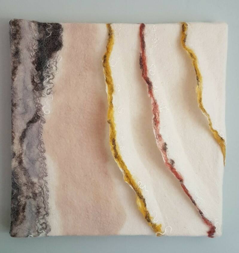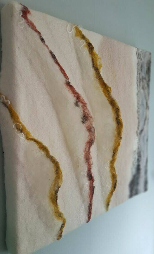 Alle Wandpanelen hebben een hart, een verhaal. Deze worden met de hand gemaakt in eigen atelier. De doeken zijn opgebouwd met meerdere lagen wol en natuurlijke vezels zoals bamboe en zijde. Het licht laat de vezels mooi zien.
